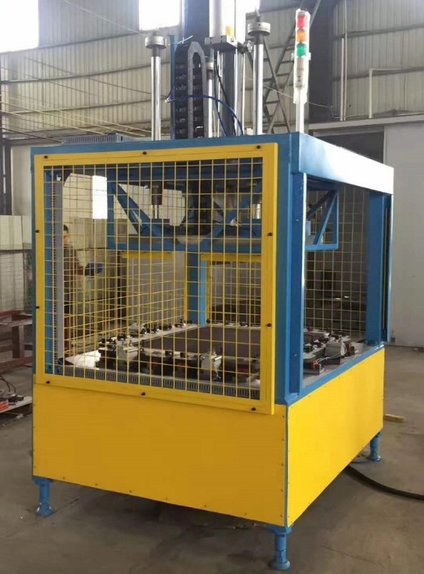 工装细节:增压缸驱动上胎模,确保骨架与面料的复合强度,包边滑块带有弹簧松紧调节机构,全工序完成后产品顶出,便于取件